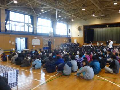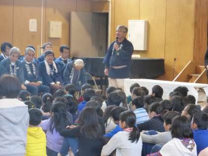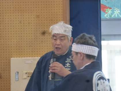 若小卒業生の方によるお餅つきの説明にみんなで聞き入っています。