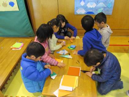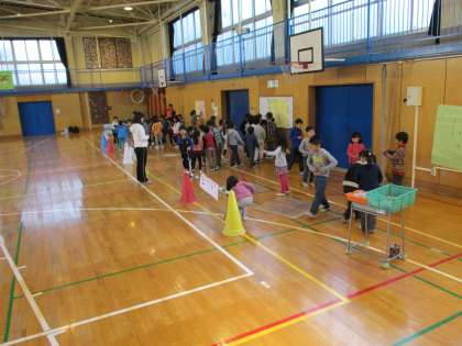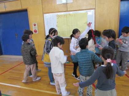 1,2年生が、世田谷保育園の5歳児のお友達を迎えて、一緒に昔あそびを楽しみました。2年生がたくさん準備をしてくれて、遊びを教えてくれました。
