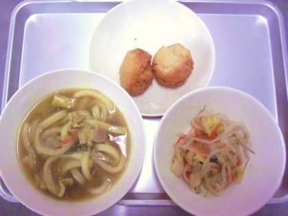 献立名:カレーうどん、牛乳、サーターアンダーギー、野菜のからしじょうゆかけ
