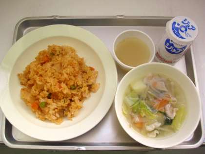 献立名:チキンライス、ジョア、ベーコンと白菜のスープ、リンゴゼリー