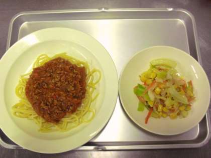 献立名:スパゲティミートソース、牛乳、コーンサラダ