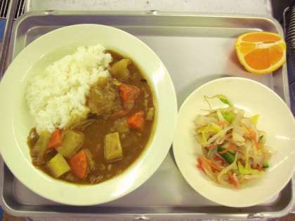 献立名:カレーライス、牛乳、こんにゃくサラダ、くだもの