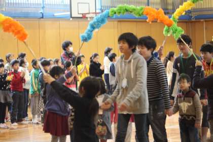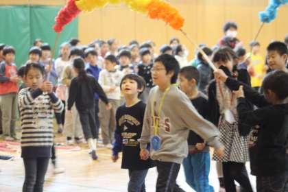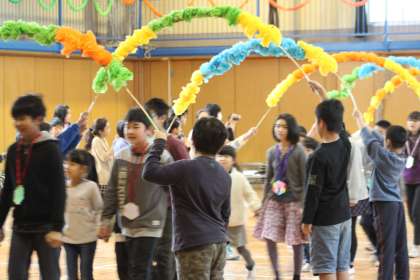 会場の体育館に6年生が1年生と手をつないで堂々入場です。