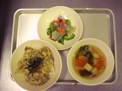 主な食材の産地:白米(茨城)、にんじん(千葉)、たまねぎ(北海道)、鶏肉(徳島)、ごぼう(青森)、こんにゃく(群馬)、油揚げ(カナダ)、鶏卵(群馬)、豆腐(大豆)(富山・滋賀)、わかめ(徳島)、だいこん(神奈川)、きゅうり(群馬)