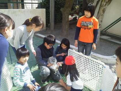 かわいいクロちゃんの感触を楽しむ若小の子たちです。