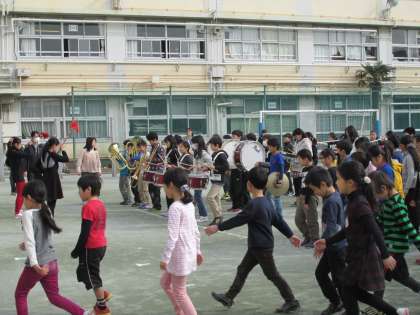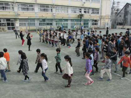 5年生が朝会の最後に鼓笛で行進に貢献しました。