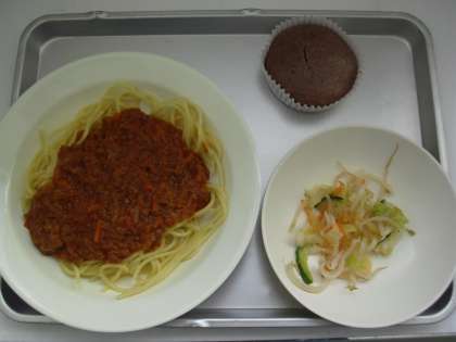 献立名:スパゲティミートソース、ジョア、イタリアンサラダ、ココアマフィン