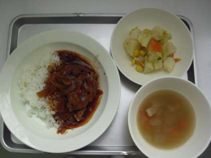 献立名:ロコモコ風、牛乳、ポテト入りフレンチサラダ、コンソメスープ