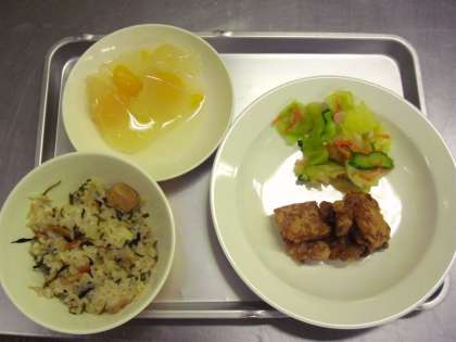 献立名:磯おこわ、牛乳、鶏肉の南蛮揚げ、野菜の浅漬け、フルーツゼリー