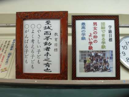 そんな真新しい教育目標が収まるのは、卒業生たちが丁寧につくってくれた額縁です。