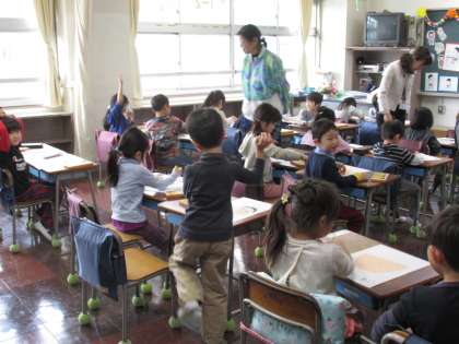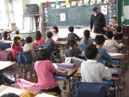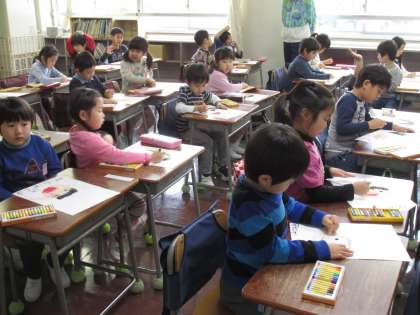 1年生が自分の似顔絵を画用紙いっぱいに描いていました。