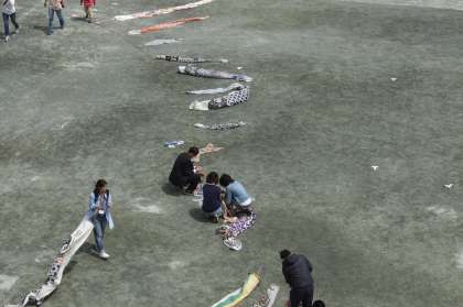 担当の役員さん方が準備をしてください、こいのぼりが次々に登場!