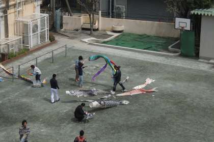 若小春の風物詩になっているこいのぼりが校庭に設置されました。