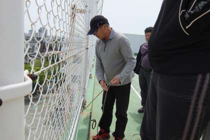 ロープにつけられたこいのぼりを泳がせるために、屋上ではロープを引き上げる準備をしています。