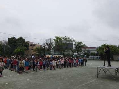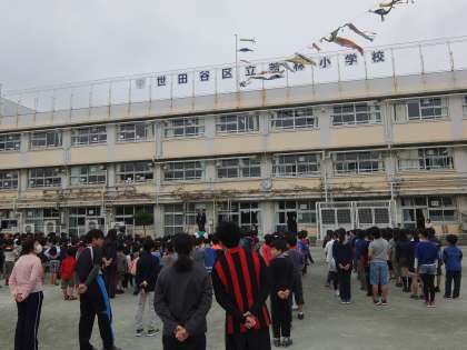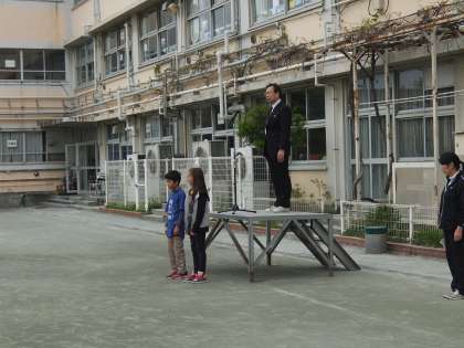 どんよりとした曇り空の下、今週の始まりを告げる全校朝会が行われました。