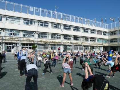 4月23日(木)、体育朝会「若小ストレッチ」を行いました。「若小ストレッチ」とは、柔軟性を高める運動を多く取り入れたものです。全校児童が元気よく声を出しながら取り組んでいました。