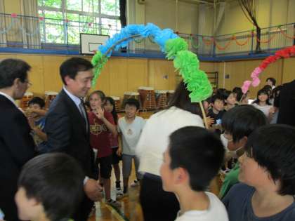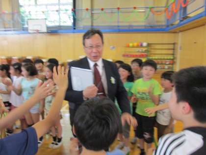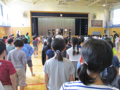 最後に全員で若小の校歌を歌い、若小を去られて先生、主事さん方を送りました。