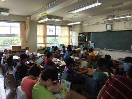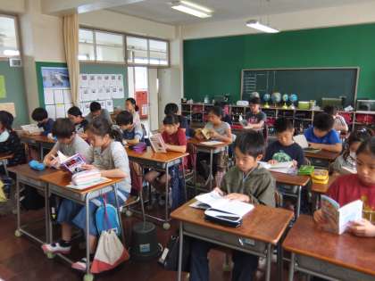 子どもたちは音楽が鳴ると静かに本を取りに行き、読書を始めています。