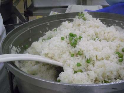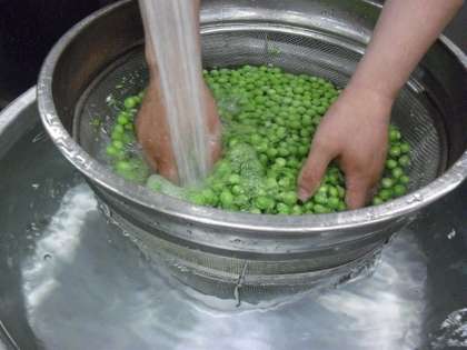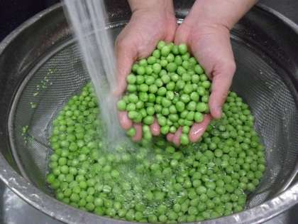 1年生たちが丁寧にむいたグリンピースは給食主事さんにバトンタッチ。