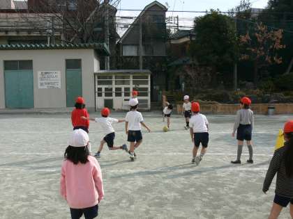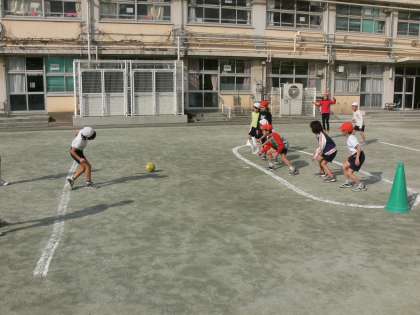 2年生の校庭体育は「たまごわりサッカー」をしています。校庭にひかれたタマゴの形の線をボールがこえると得点です。どの子にもボールをける、ボールを止めるチャンスがあり、子どもたちは楽しそうにゲームをしています。