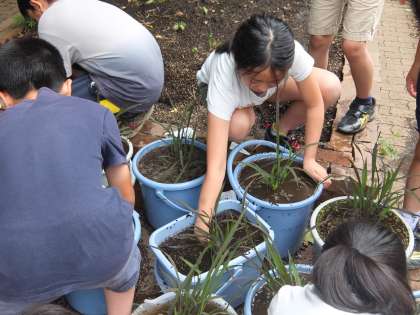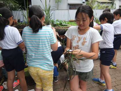 5年生が毎年育てているバケツ稲ですが、今日は遅めの田植えを行いました。