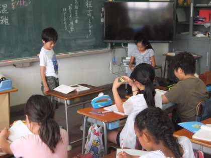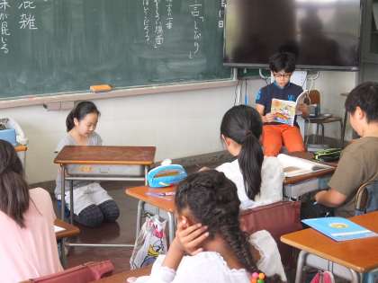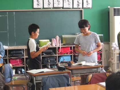 5年生が国語で学習している狂言「しびり」を実際に演じてみました。