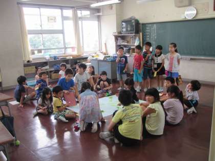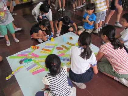 各クラスでつくってきた短冊や七夕飾りを台紙に貼り付けます。