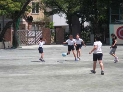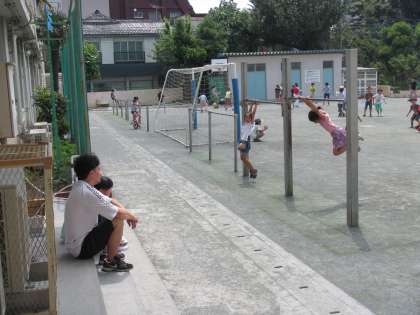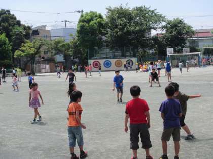 校庭では子供たちが元気いっぱいに遊んでいます。