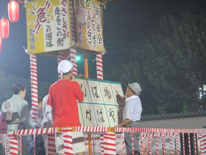 櫓の上に設けられた抽選版にみんなが注目しています。