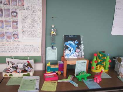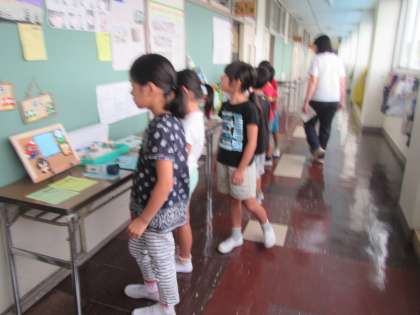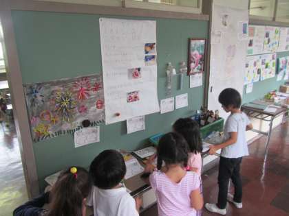 休み時間になるといろんな学年の教室前に出かけて作品を鑑賞する姿も見えます。