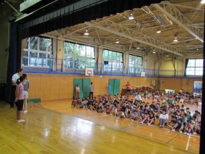 全校児童の前で大きな拍手を受けました。