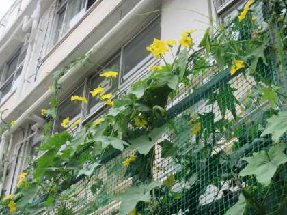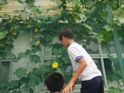 今日は職員室前にできている緑のカーテン(ヘチマ)をつかって、雄花と雌花の違いを見つけました。