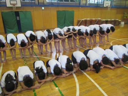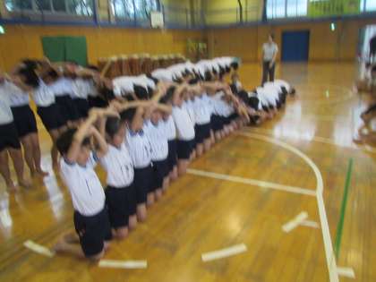 5、6年生が体育館で組体操の練習をしています。