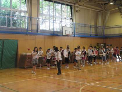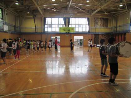 体育館に盛大なドラムマーチが響き渡る中、若小名物鼓笛隊の登場です!