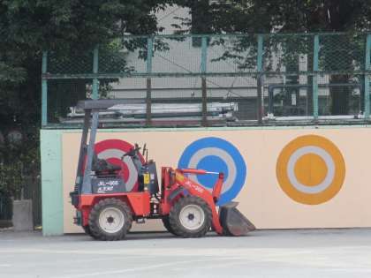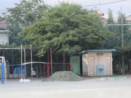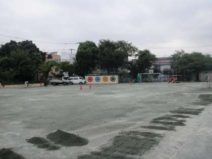 都民の日のために授業はお休みですが、若小の校庭では業者の方が入って校庭整備をしてくれています。