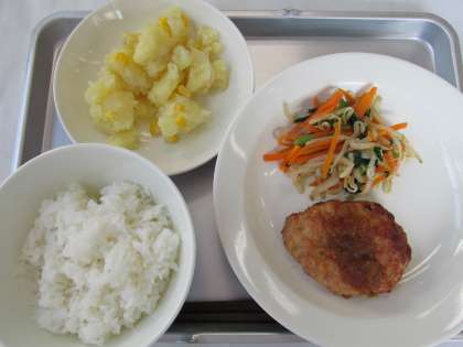 【献立】ごはん・豆腐入りハンバーグ・和風ソース・おひたし・コーンポテト