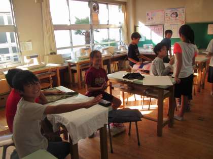 6年生が家庭科の時間にリサイクルクッションづくりをしています。