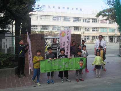 今日から若小班ごとに行う、たて割りあいさつ運動が始まりました。