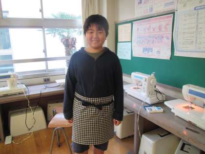 5年生が家庭科で制作をしているカフェエプロンがほぼ完成しました。