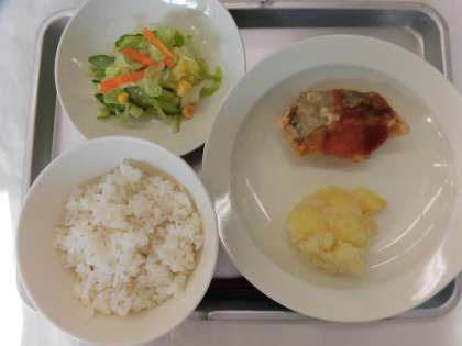 【献立】ごま入りごはん・魚のバーベキューソース・粉吹き芋・ゆで野菜・牛乳