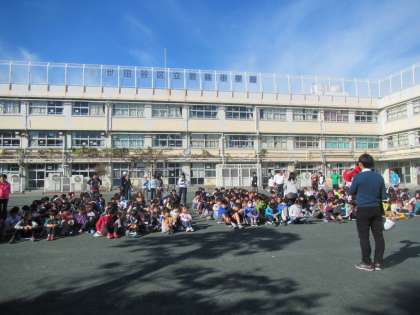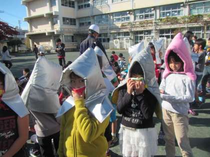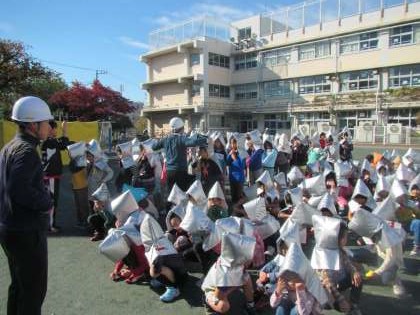 放送が鳴るとみんな静かに防災頭巾を装着!