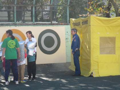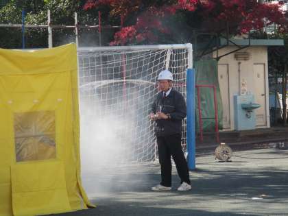 今日の避難訓練では、火災を想定しての煙中訓練も同時に行いました。