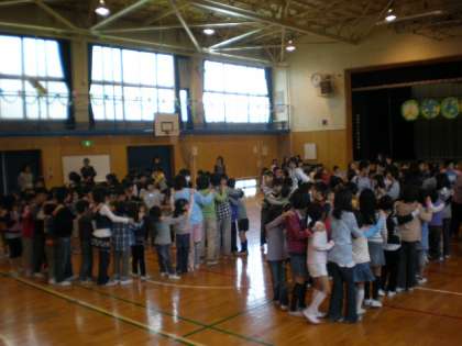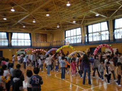 2年生〜6年生でお祝いの歌を歌ったり、全校児童でじゃんけん列車をしたりしました。
