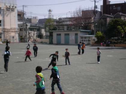 会が終わったあと、1年生は、6年生と一緒に初めて校庭で遊びました。