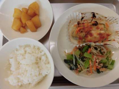【献立】ごはん・魚のみそチーズ焼き・おひたし・じゃがいもの甘辛煮・牛乳