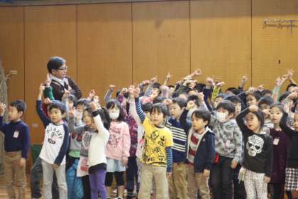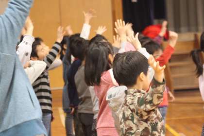 体育館に集まった若小の子達が元気いっぱいに歌います。