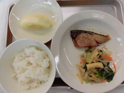 【献立】ごはん・ぶりの七味焼き・カリカリ油揚げと野菜のひたし・りんご