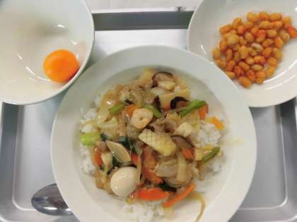 【献立】中華丼・スパイシービーンズ・きんかん・牛乳