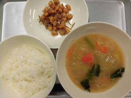 【献立】ごはん・肉団子入りみそ汁・大豆とじゃこのみそ汁・牛乳