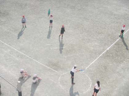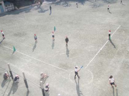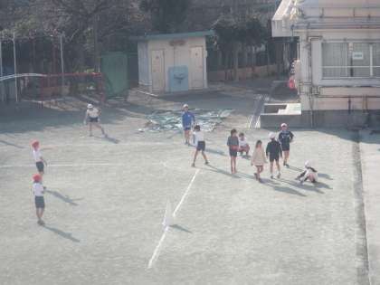 校庭では4年生たちが元気いっぱいに体育をしています。